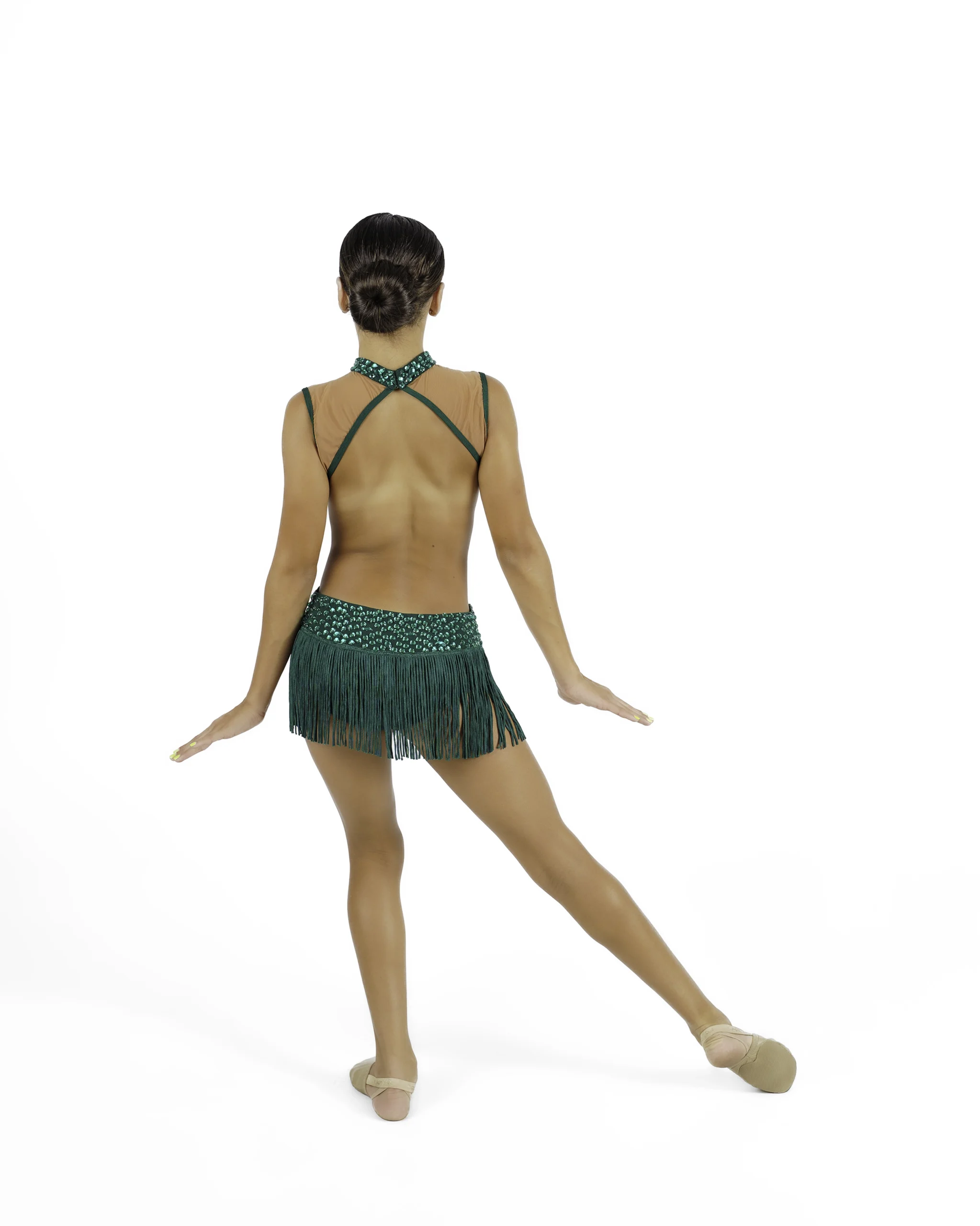 - Skirt: Playful emerald fringe that enhances motion on stage